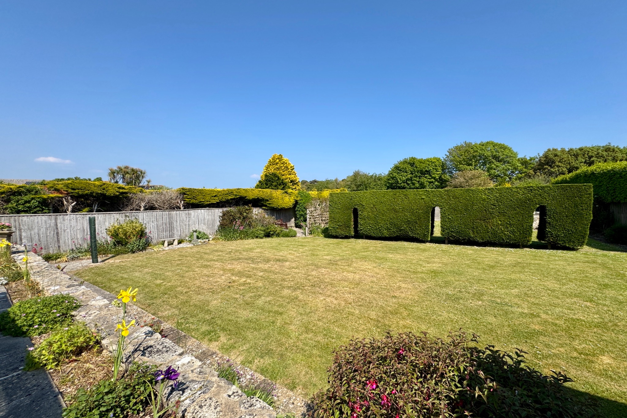 The property is approached by a sweeping in-and-out pavioured driveway leading to the integral double garage and provides parking for 3-4 vehicles. The gardens surround the property and have been well tended by the current owner. The front is lawned with a mixed border of mature shrubs. The good sized garden at the rear is predominantly lawned with raised paved terrace, mixed mature shrub borders, stone store and hedging creating a private space.