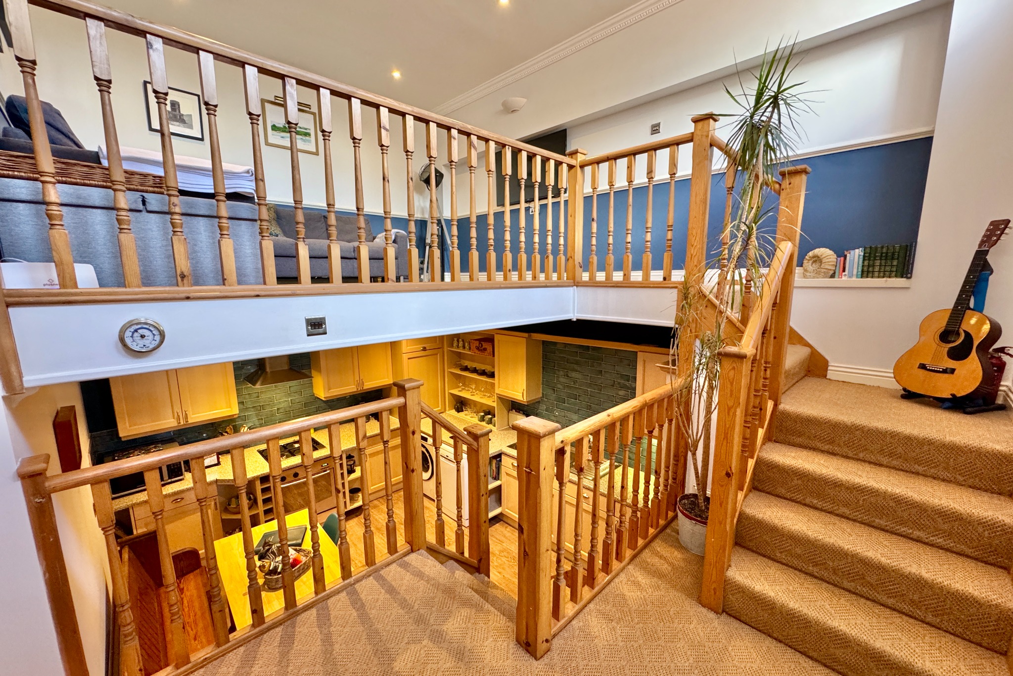 The entrance hall and split level galleried landing welcomes you to this stylish apartment and leads to the spacious living room. A short flight of stairs lead to the kitchen/breakfast room which is fitted with a range of light wood effect units, contrasting worktops. and integrated gas hob and electric oven. There is also ample room for a table and chairs.