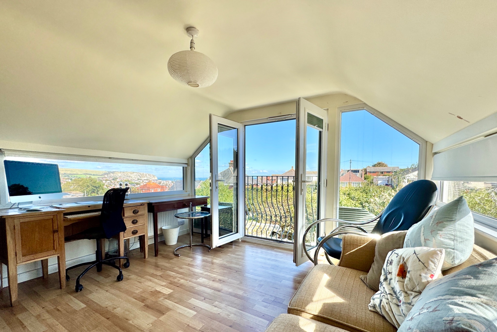 The spacious first floor accommodation has been designed to incorporate a principal en-suite bedroom with WC and a second living area. Double doors open to a Juliet balcony to enjoy the panoramic views of the sea and Purbeck Hills in the distance.