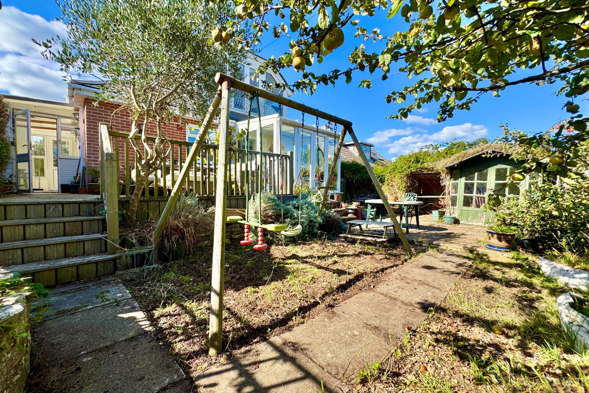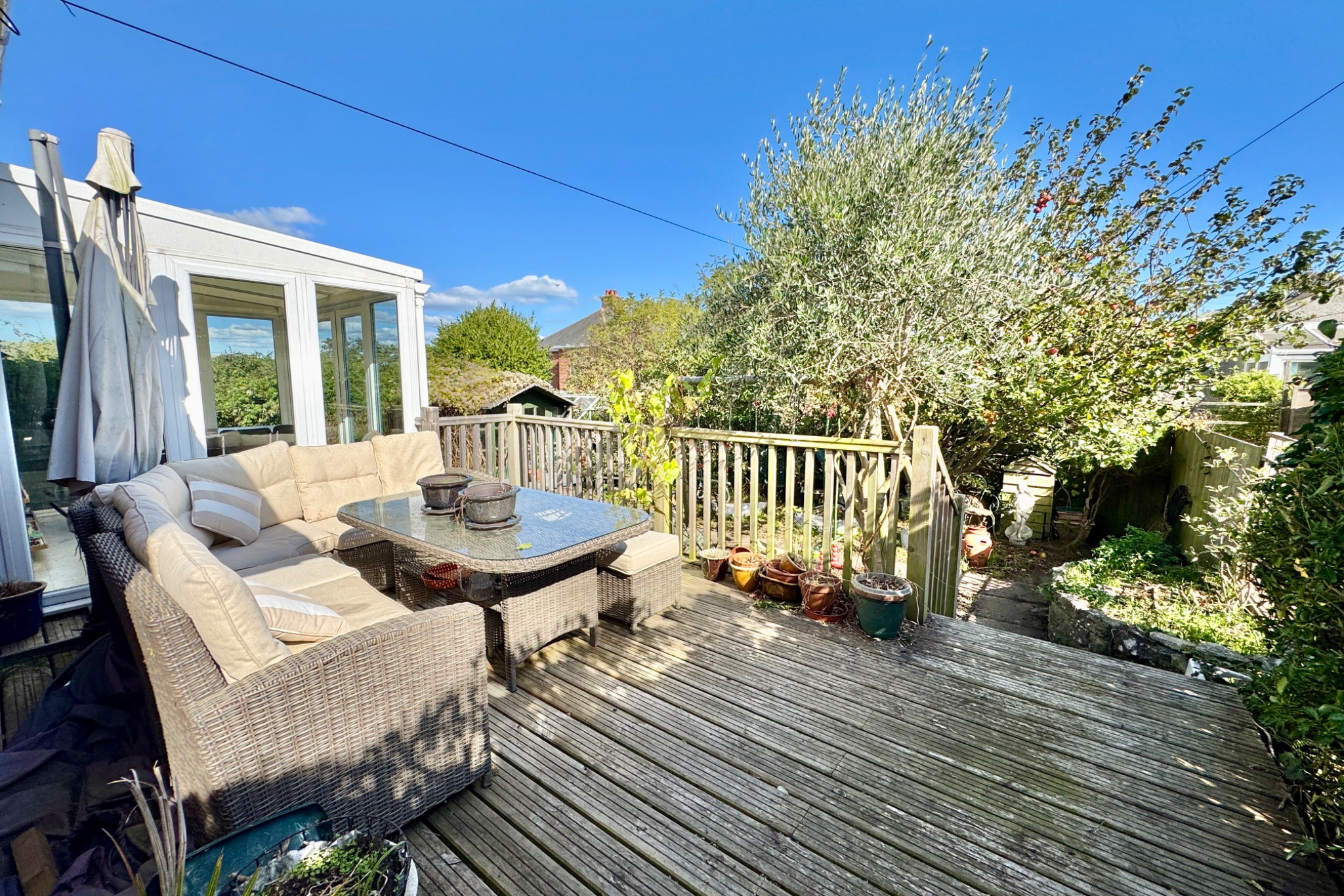 From the front entrance porch, a useful coat storage area, the hallway leads to the generously sized dual aspect living room/dining room; there is access to the first floor from this room. At the rear of the property is a superb conservatory with double doors opening to the rear garden harmoniously blending the indoor/outdoor living space and enjoying good views across the town of the Purbeck Hills. The kitchen has been re-fitted with a stylish range of white gloss units and a range of integrated appliances. Leading off, the side porch gives access to the front and rear gardens.