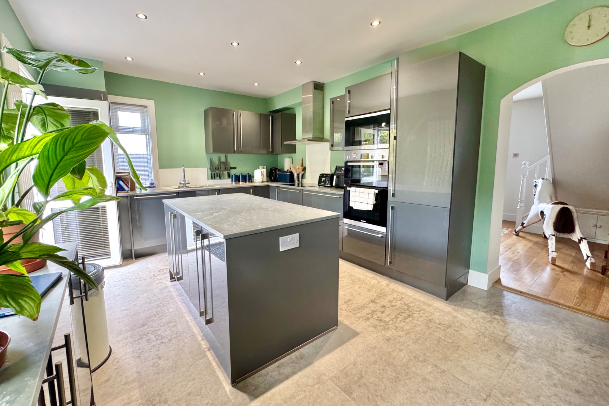 The spacious entrance hall, currently used as a dining hall, welcomes you this substantial family home. The heart of the home is the thoughtfully designed kitchen fitted with stylish grey gloss units with contrasting worktops and central island unit. A suite of integrated appliances including electric hob, double oven, fridge, freezer and dishwasher, complemented by the utility room ensuring that practicality meets style. Leading off, the generously sized L-shaped living room has double doors to the patio, seamlessly blending the indoor/outdoor living space. A dedicated home/office and ground floor double bedroom complete the accommodation on the ground floor.