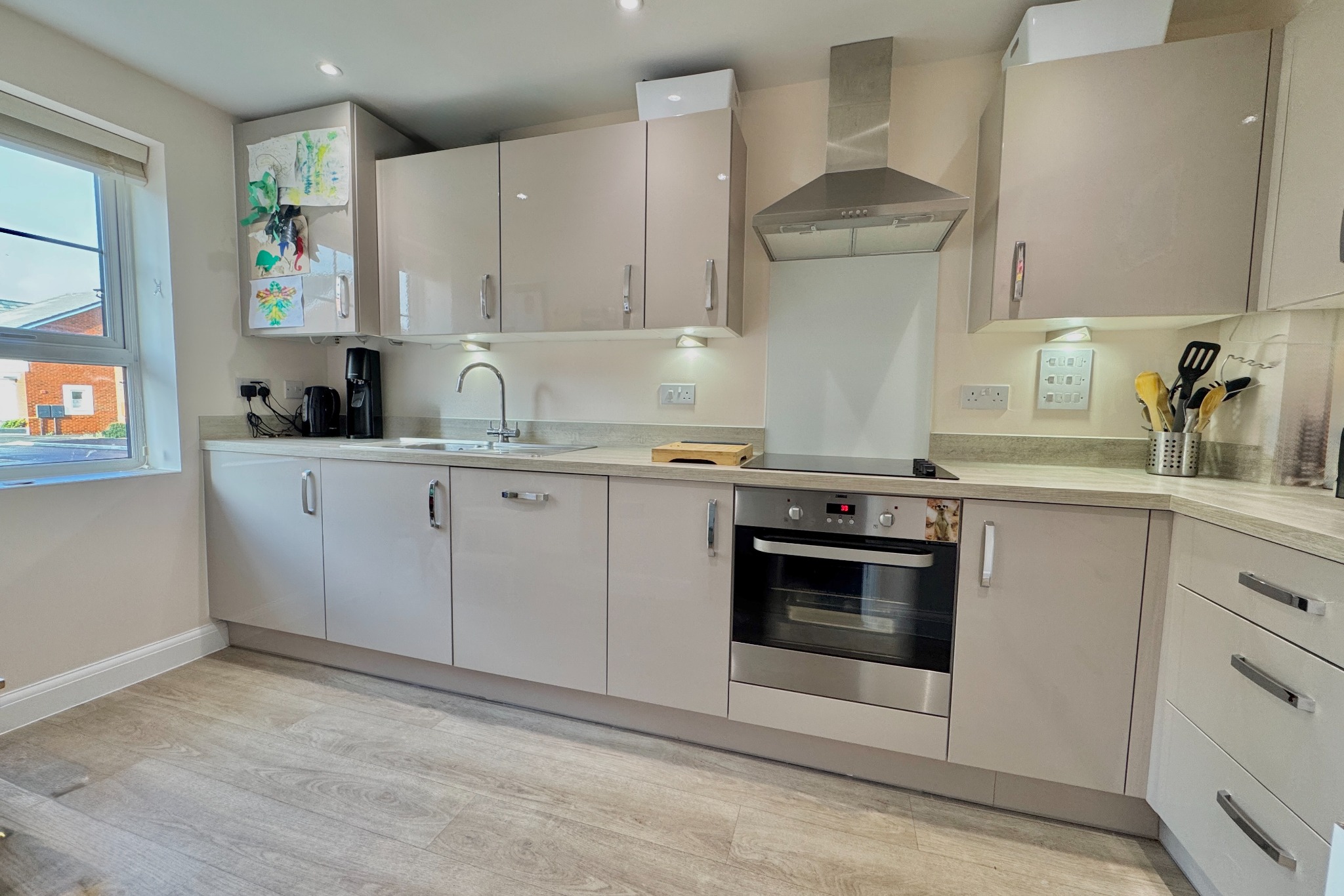 This stylish family property offers excellent well-planned accommodation, creating a light and spacious home. The entrance hall leads you to the generously sized, living room with double doors opening to the paved patio area and rear garden, harmoniously blending the indoor/outdoor living space. The kitchen is fitted with an extensive range of light units, complementing worktops and integrated dishwasher, fridge, freezer, electric oven and hob. There is also a cloakroom on this level.