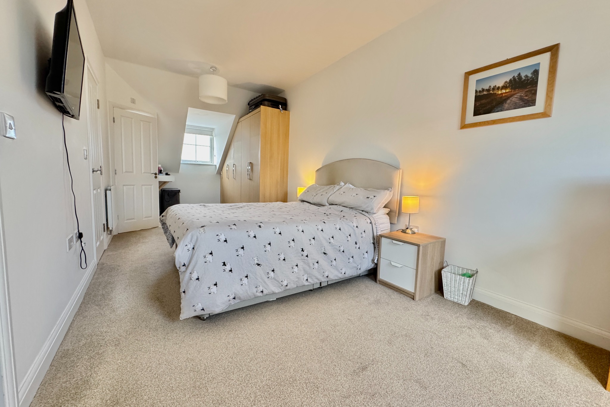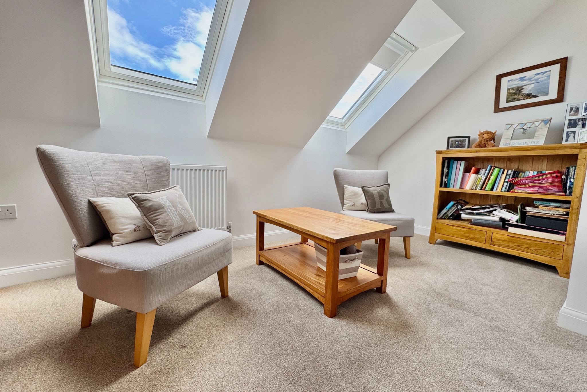 On the first floor there are two bedrooms. Bedroom two is a good-sized double and has some views of the Purbeck Hills. Bedroom three is a further double at the rear of the property with the benefit of ‘Jack and Jill’ access to the bathroom. The family bathroom is fitted with a white suite including bath with shower over. The impressive dual-aspect principal bedroom suite comprises the entire second floor and has views of the Purbeck Hills and open country, and the benefit of an en-suite shower room.
