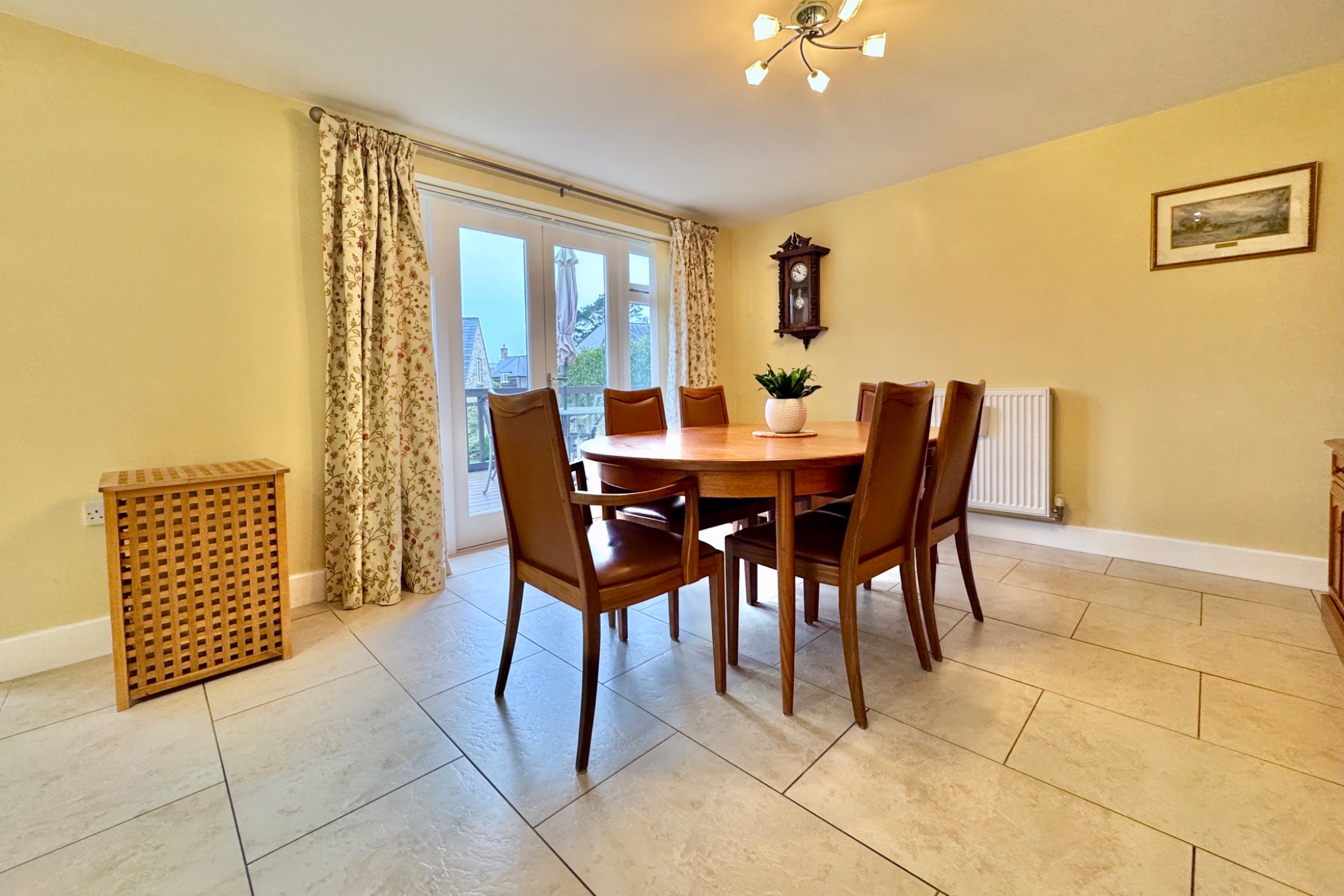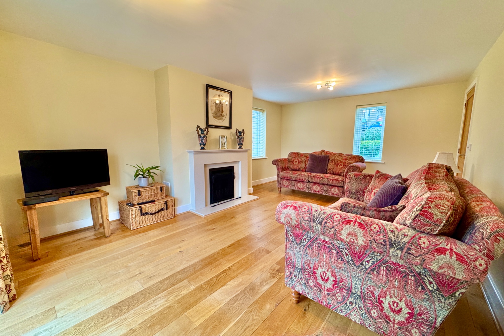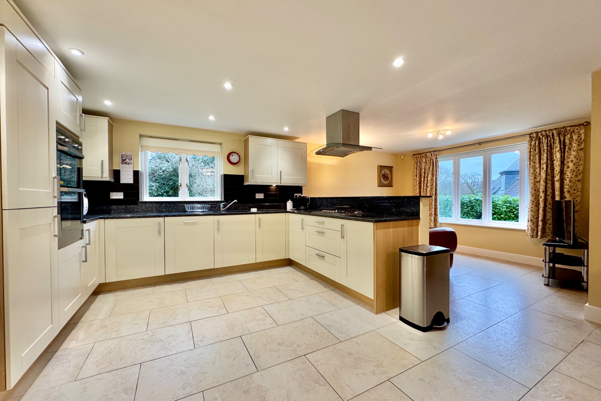 You are welcomed to “Methleigh” by the spacious entrance hall which leads through to the large triple aspect living room with feature fireplace and double doors opening to the South facing terrace and garden. The exceptionally spacious dual aspect kitchen/dining room is the perfect entertaining space in this family home. The kitchen area is fitted with an extensive range of cream units, contrasting worktops, and integrated gas hob, oven and dishwasher. There is also a separate utility and cloakroom on this level.