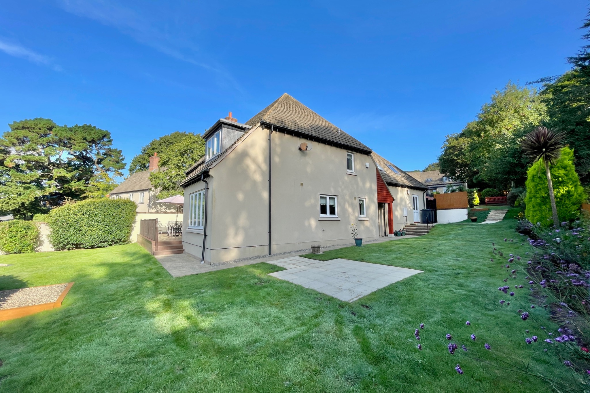 Set in attractive grounds which surround the property, a shared paved driveway leads to the attached double garage with automatic door and parking in front for 2 vehicles. The gardens are mostly laid to lawn with flower and shrub beds, paved patio areas and a wide composite terrace which faces South.