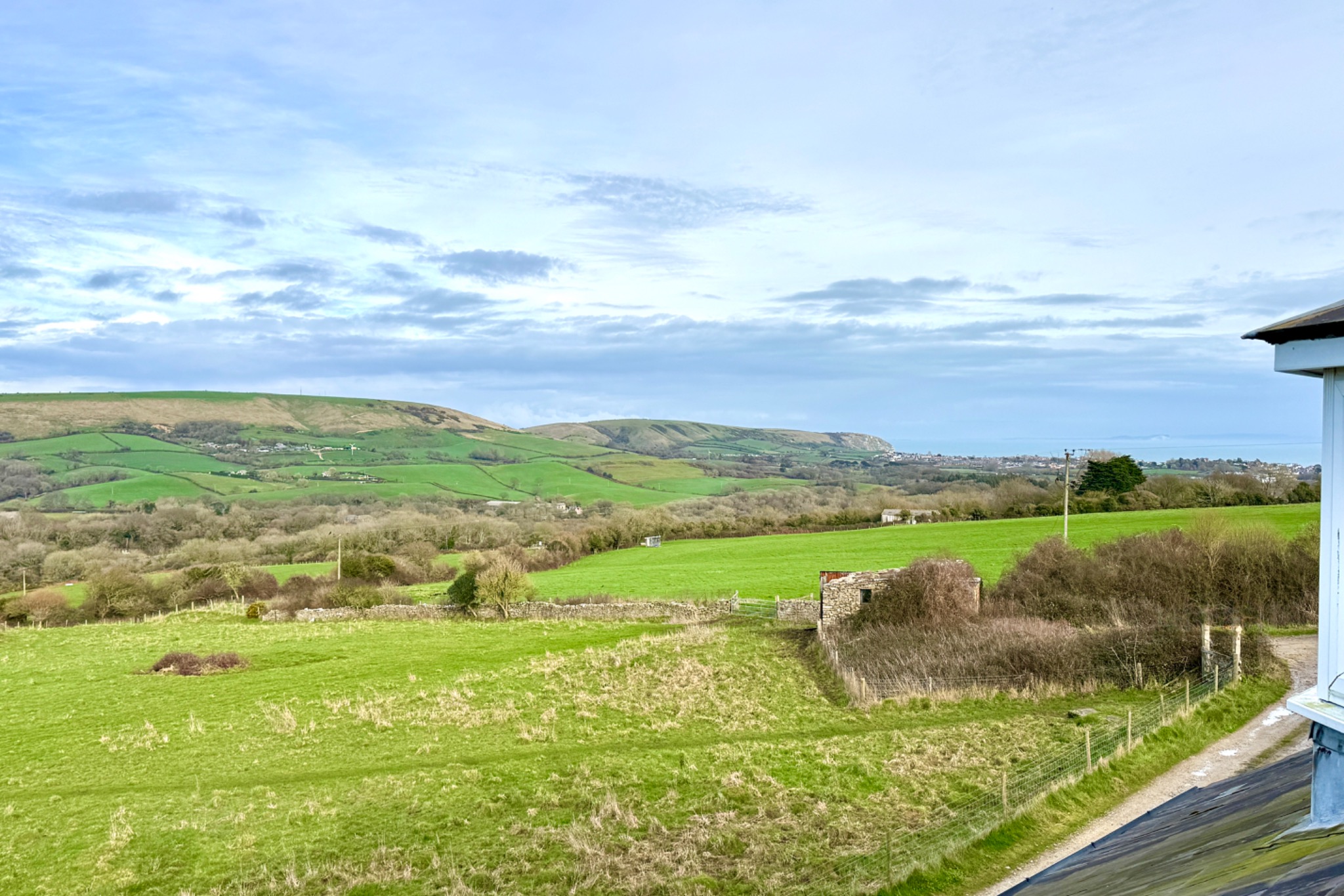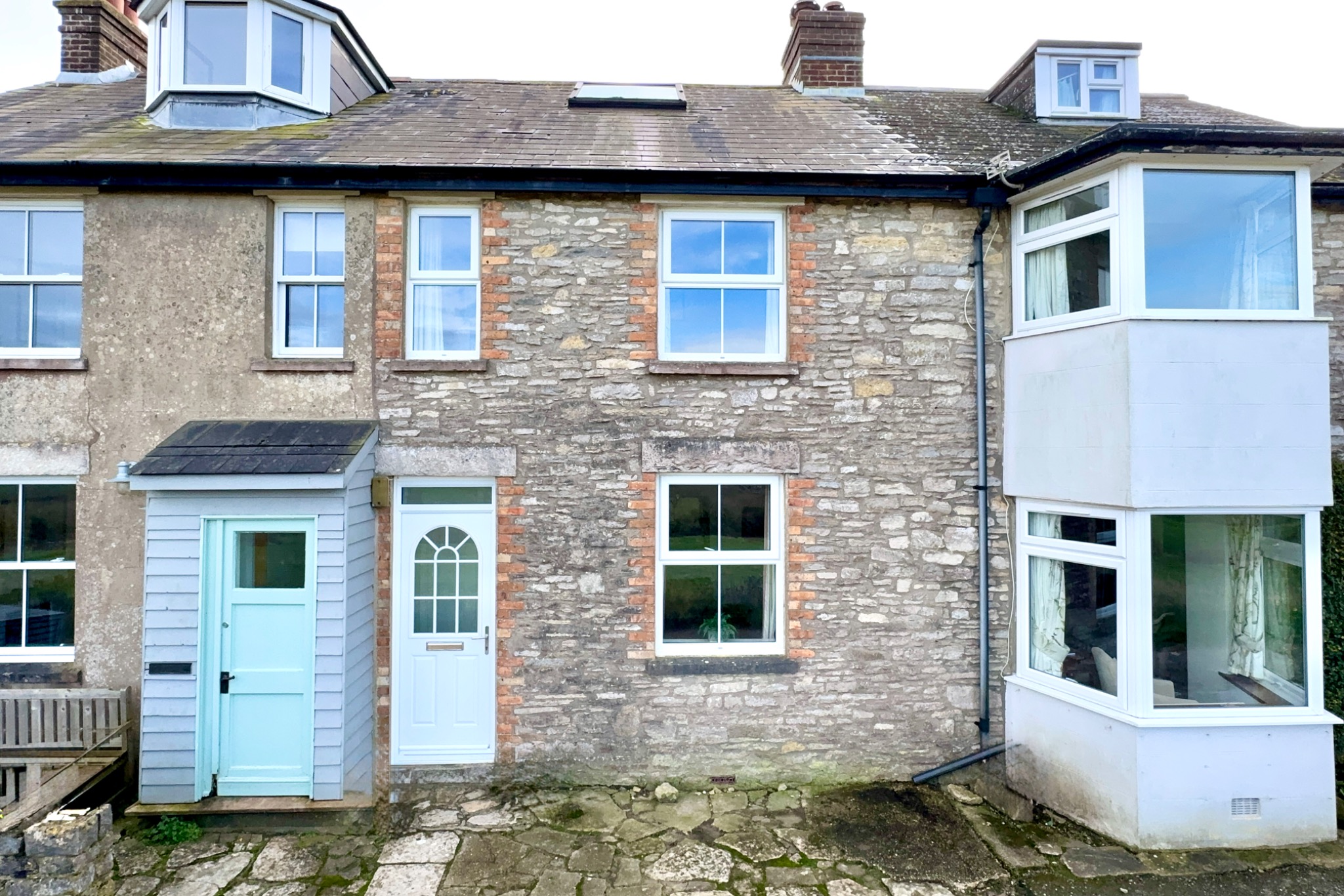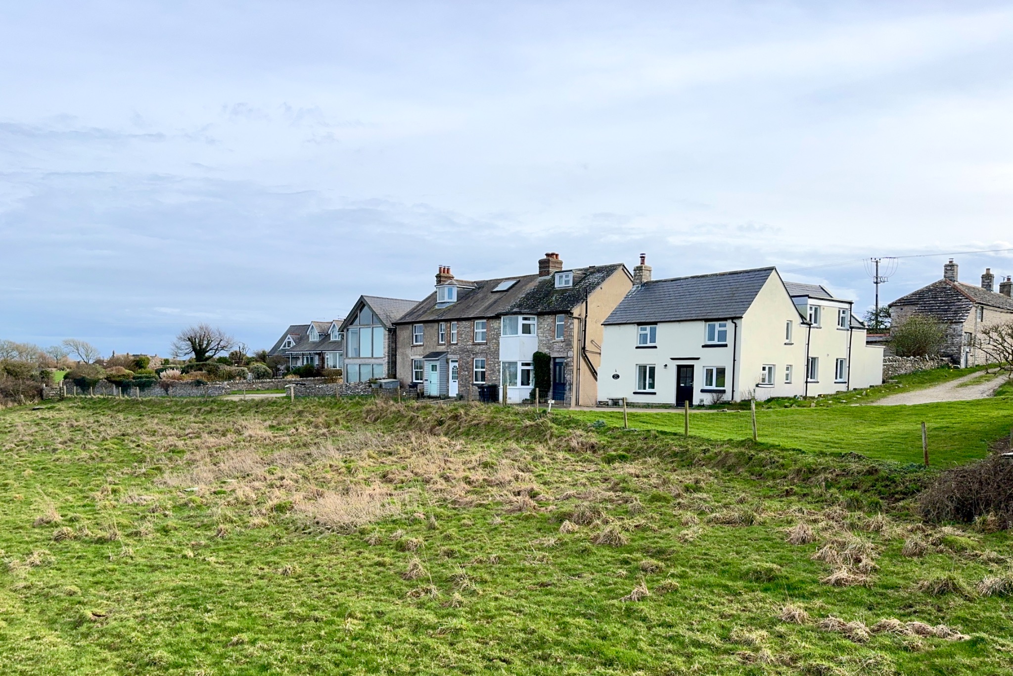 Castle View is a small terrace of 3 cottages situated in a tranquil setting on the outskirts of the village of Langton Matravers. Approached by an unmade lane adjoining farmland, it enjoys excellent views over open countryside towards Corfe Castle and the Purbeck Hills. It is ideal for a country retreat and for walkers with the iconic Jurassic Coastal walks nearby.