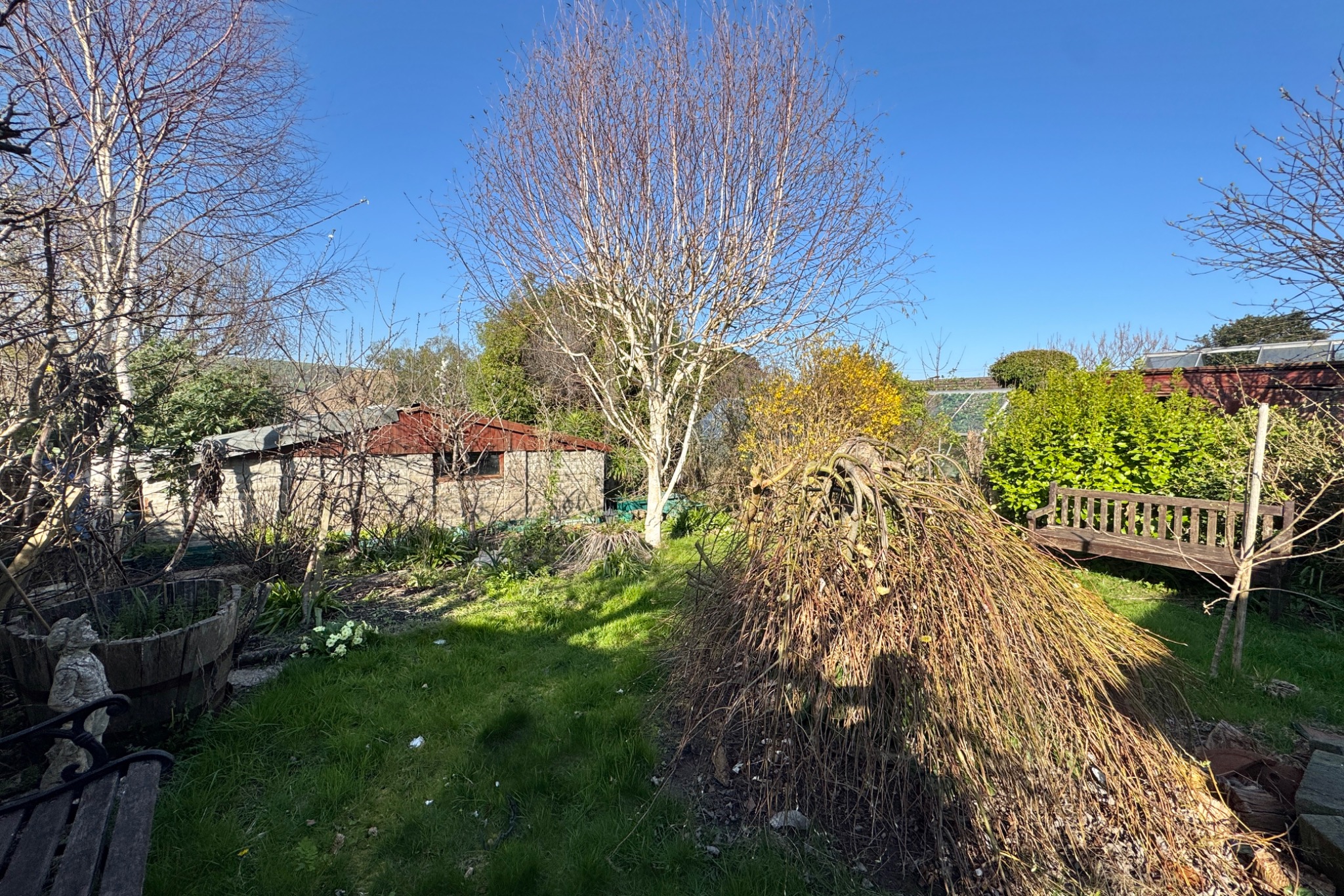 Outside, the front garden is partially lawned with shrub borders. A concrete paved driveway provides ample off-road parking and leads to a detached single garage. At the rear, the large garden is mostly laid to lawn with a paved patio area, flower and shrub beds, fruit trees. A second detached double garage is accessed from the rear service lane.
