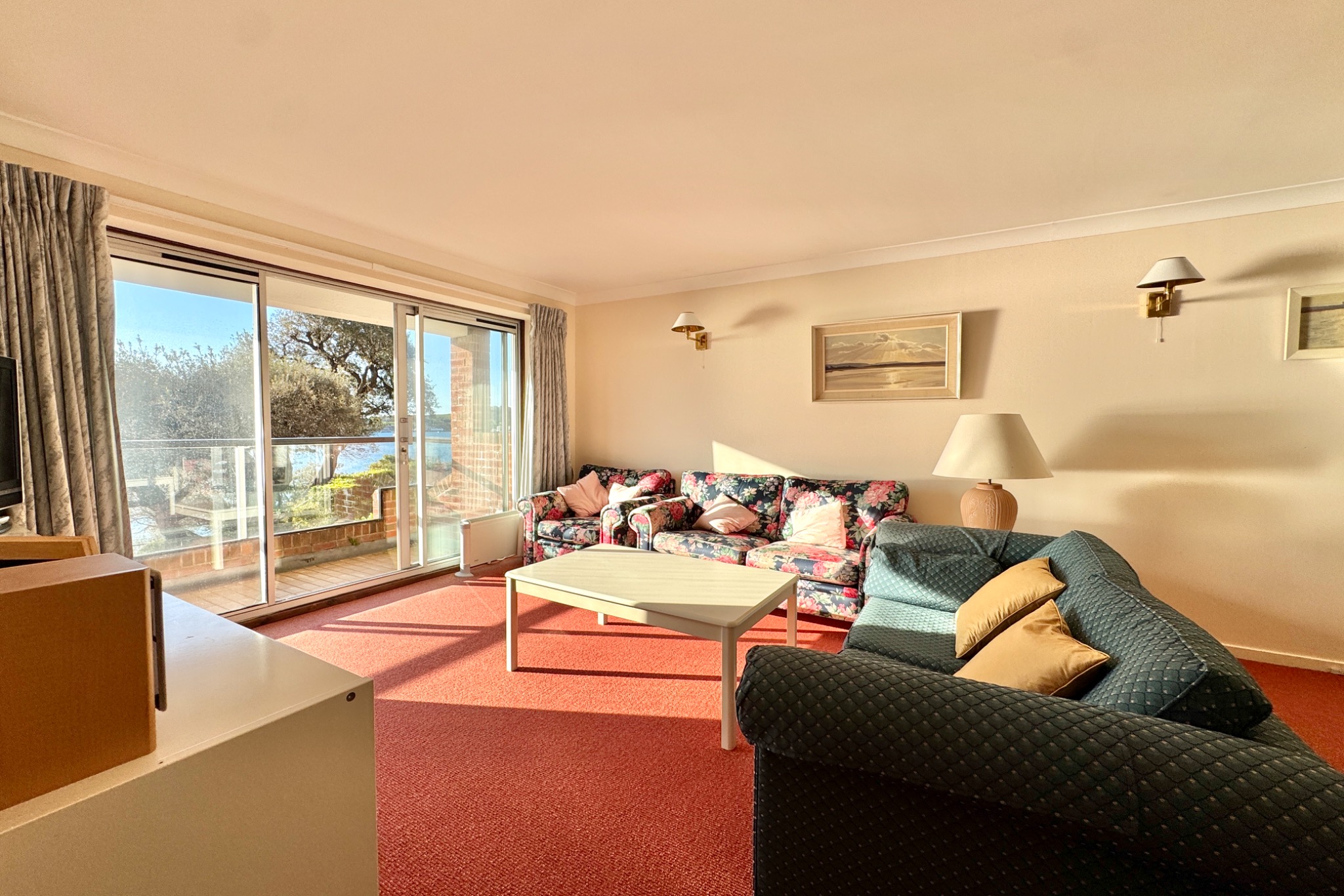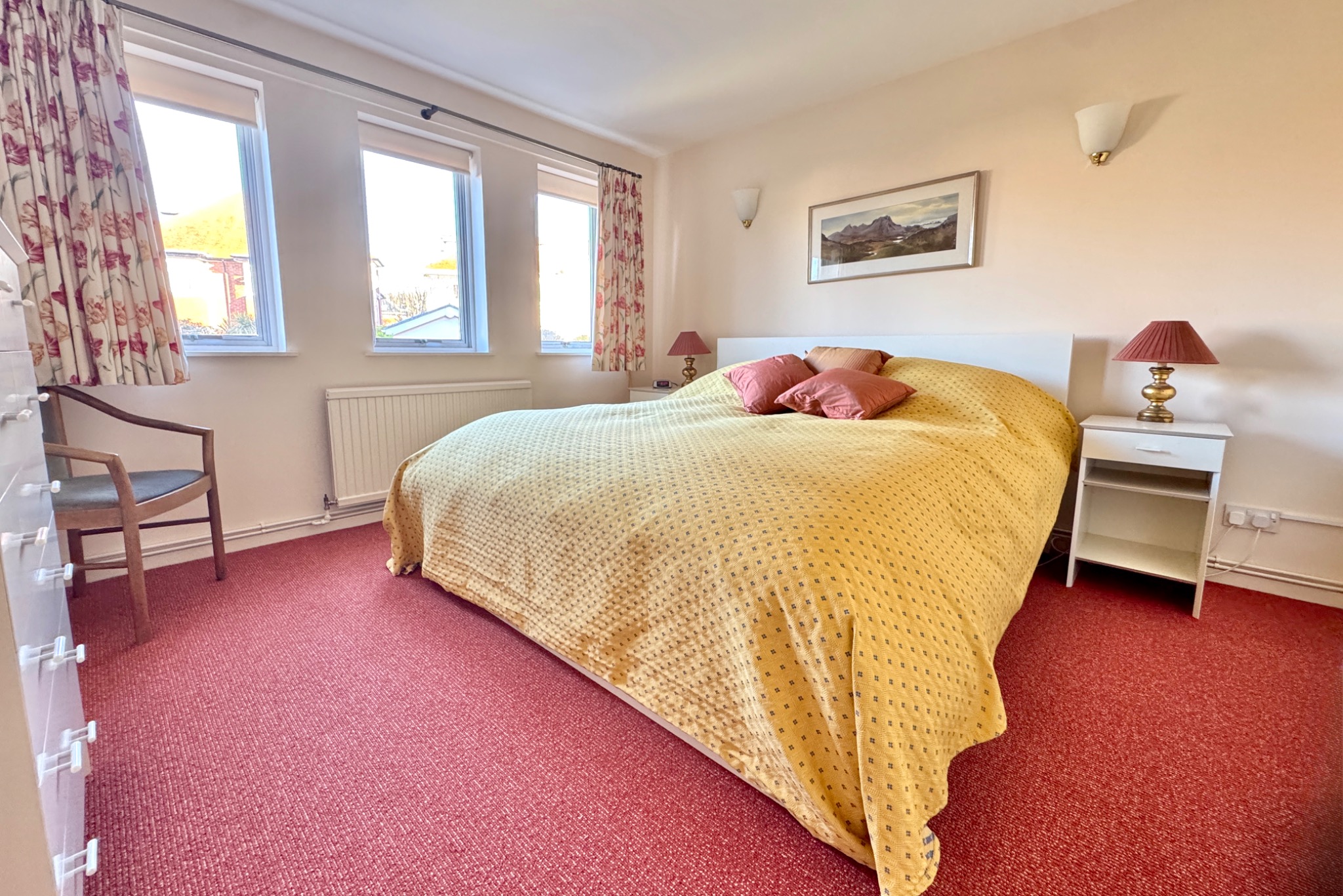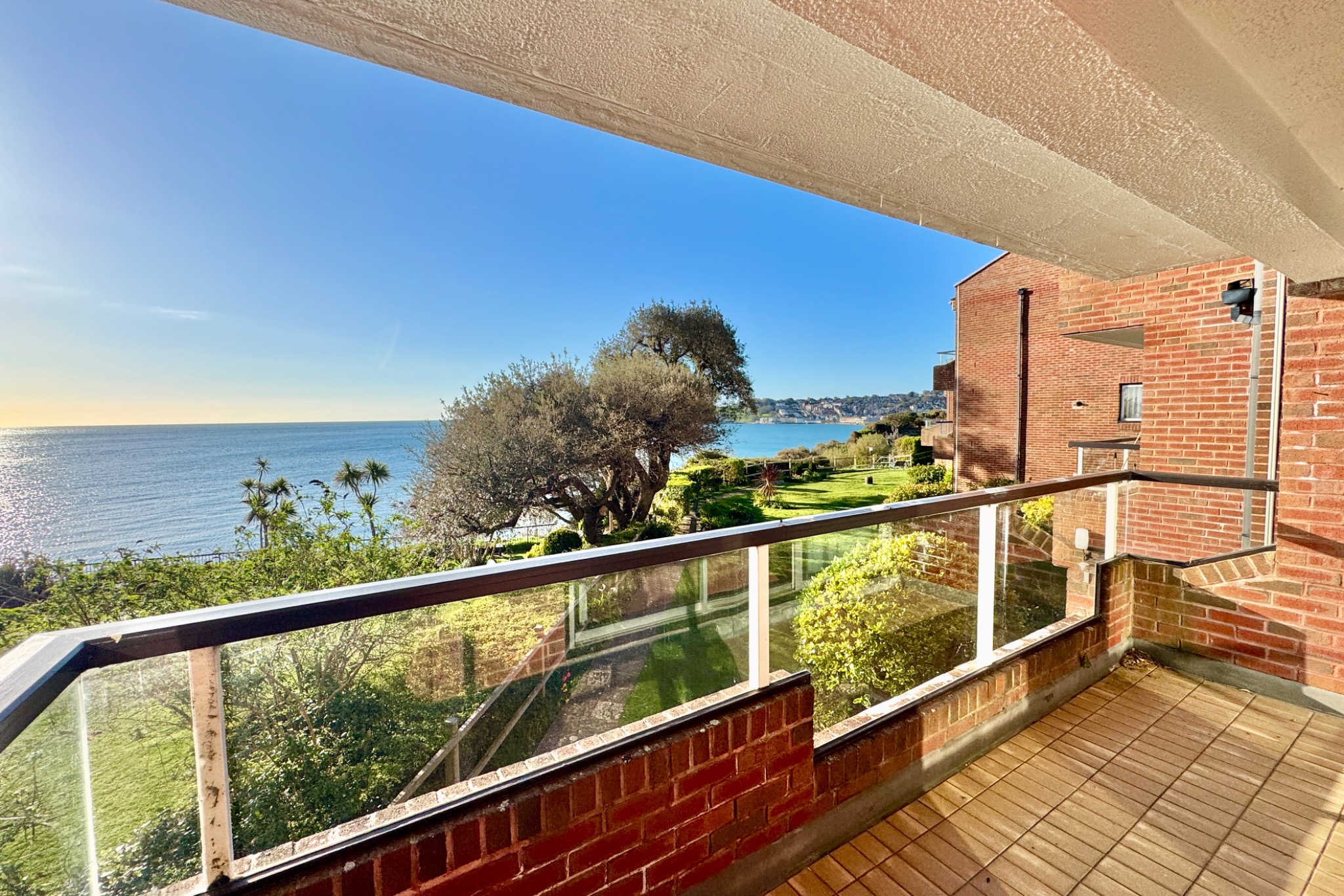 This apartment is well presented and has the considerable advantage of a large open plan living/dining room with full width glazed sliding doors leading to the balcony framing the magnificent sea views, 2 double bedrooms and a garage. The building was constructed during the 1980s of traditional cavity brick under a pitched roof covered with concrete interlocking tiles.