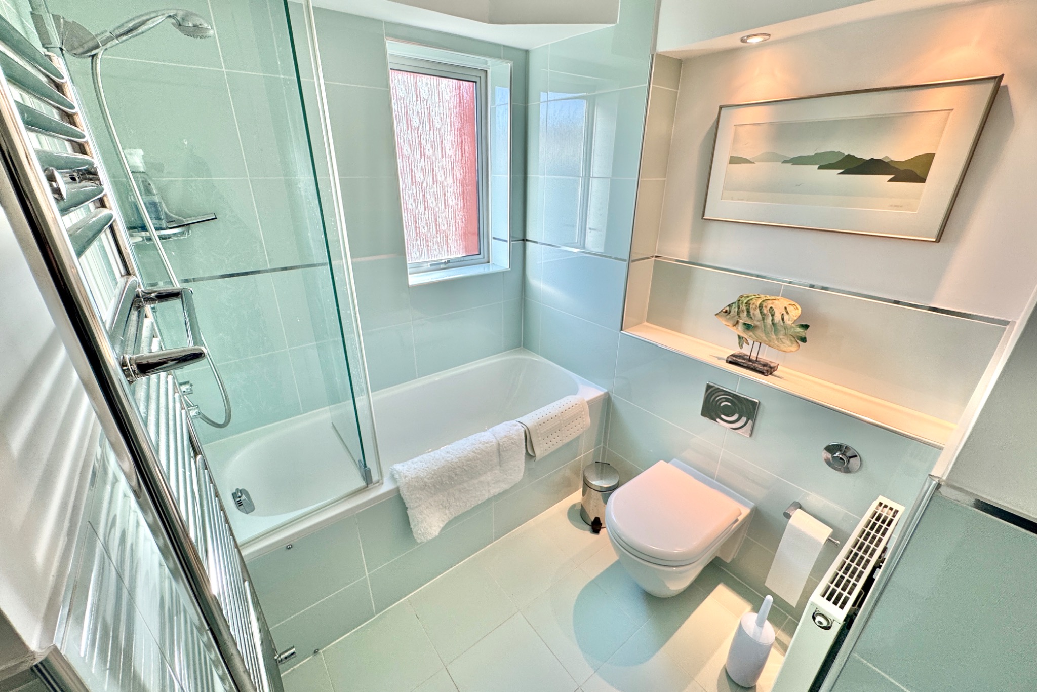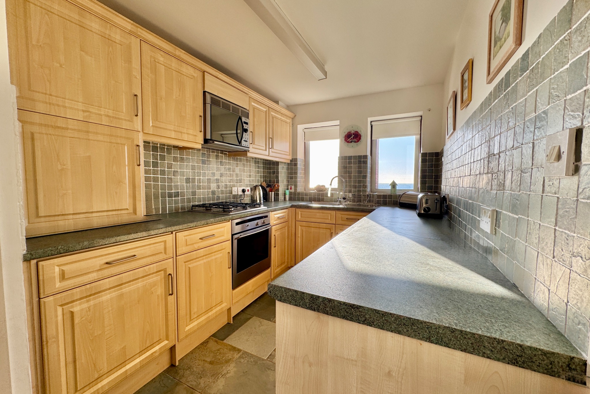 The entrance hall welcomes you to this superb apartment. The open plan living/dining room is generously sized with full width glazed patio doors leading to a good sized balcony to enjoy the superb views and ample space for outdoor dining and relaxing. The dual aspect kitchen/breakfast room is fitted with a range of light wood units, with contrasting worktops, integrated gas hob, electric oven, fridge/freezer and washing machine. This room also enjoys excellent sea views.