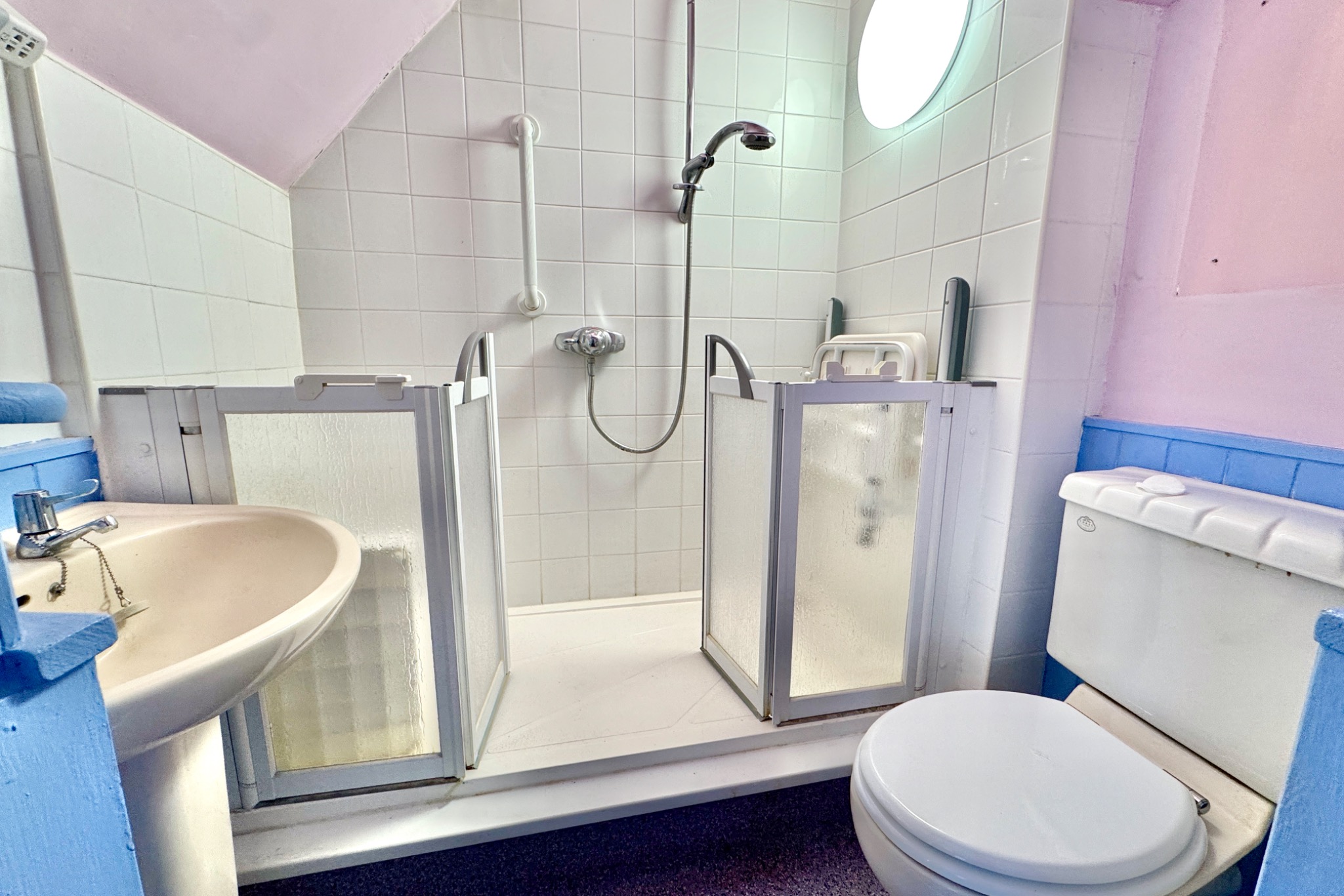 On the first floor, the staircase leads directly to the bedroom. The shower room is fitted with a white suite including accessible shower, WC and wash basin.