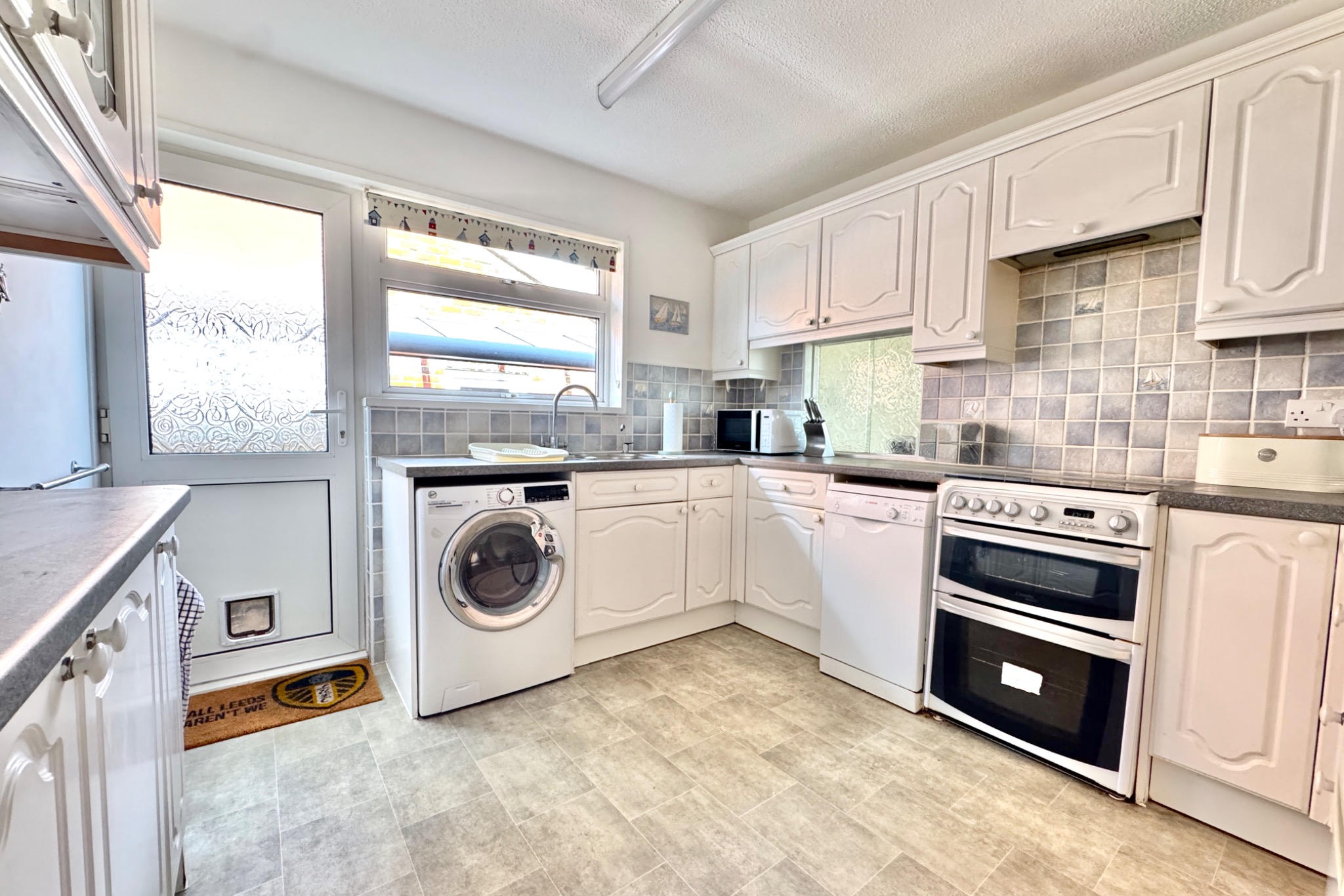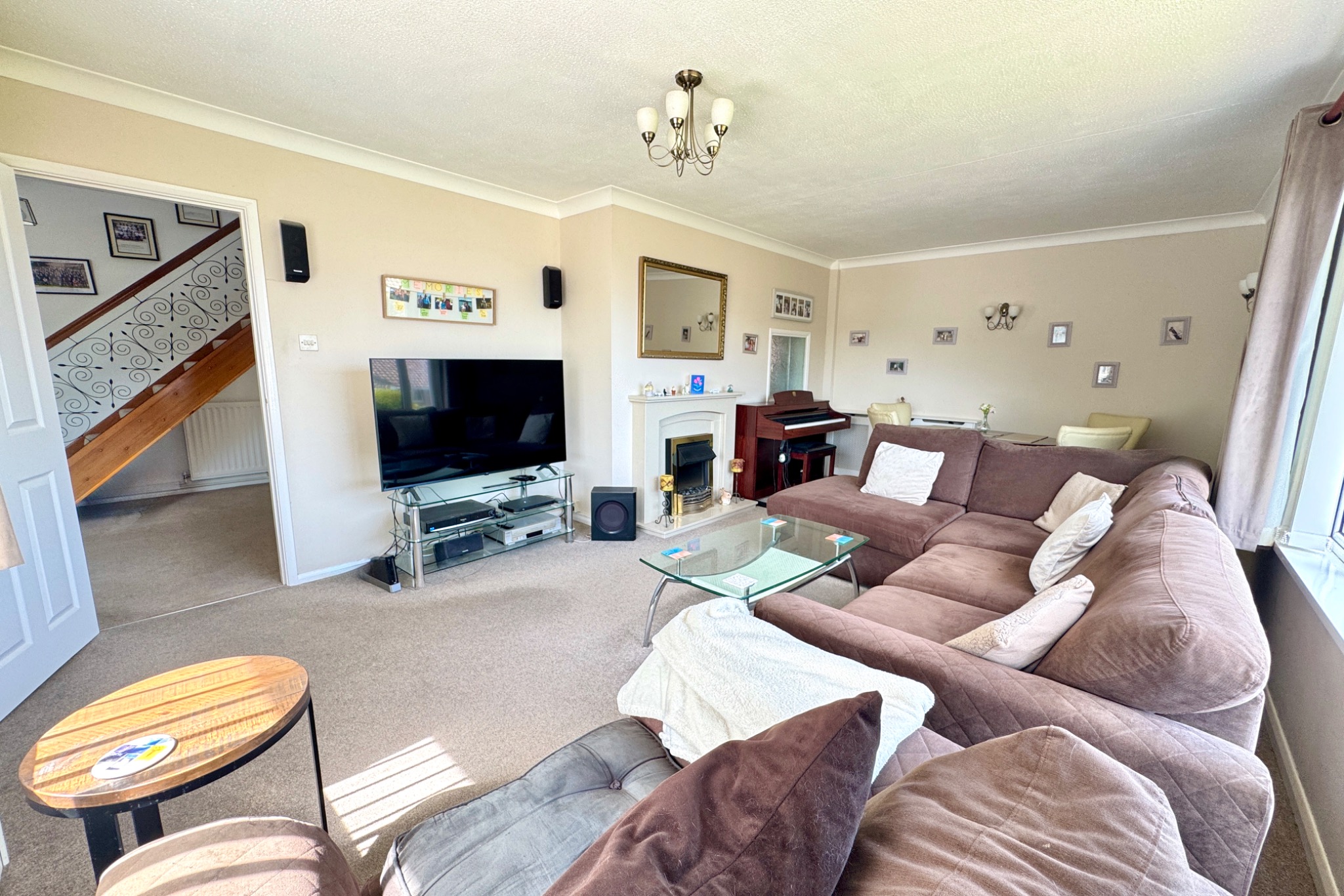 The entrance porch and spacious hall welcomes you to this chalet style residence. Leading off, the generous dual aspect living room has an attractive modern fireplace and a large picture window to the front. The separate kitchen is fitted with a range of white units, contrasting worktops, and has space for an electric oven, washing machine and dishwasher. There is also side access to the garden.